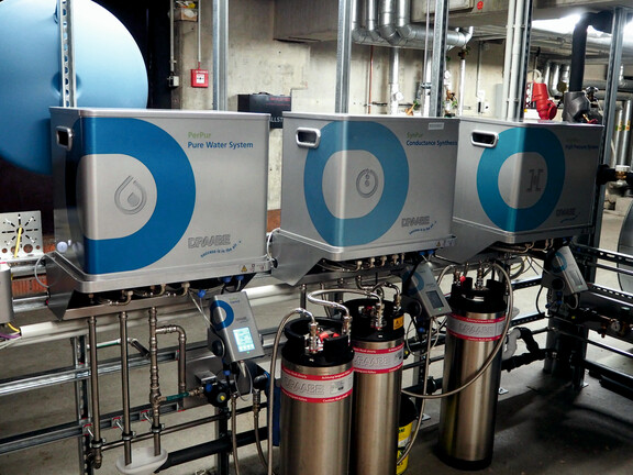 Eine hygienische und sichere Luftbefeuchtung ist eine wesentliche Voraussetzung für den Flughafenbetrieb. Die Qualität und Hygiene der Direktraumbefeuchtung wird durch eine mehrstufige Wasseraufbereitung gewährleistet, die aus einem Enthärter, Filterstufen, einer zentralen Umkehrosmose und einer zusätzlichen UV-C-Desinfektion besteht. Regelmäßige Kontrollen, Desinfektionen und der Austausch stark beanspruchter Systemkomponenten sind notwendig, um eine Kontamination der wasserführenden Elemente zu verhindern. Sowohl die systemeigene Wasseraufbereitung als auch die Hochdruckpumpe des Systems sind in tragbaren Kleincontainern untergebracht, die zu Wartungszwecken ausgetauscht werden. Im Rahmen eines automatisierten Wartungsplans erhält der Flughafen Nürnberg alle sechs Monate vollständig gewartete und desinfizierte Ersatzgeräte, die außerhalb des Sicherheitsbereichs in einem Technikzentrum installiert und leicht zugänglich sind. „Neben der hochwertigen adiabatischen Hochdrucktechnologie ist dieser Containeraustausch eines der Alleinstellungsmerkmale von Condair Systems. Für uns bedeutet dieser Service hohe Sicherheit, einfache Handhabung und geringen Aufwand“, erklärt Thomas Harrer. Dass das System auch während des Betriebs hygienisch funktioniert und dem neuesten Stand der Technik entspricht, wird einmal jährlich von VDI-zertifizierten Fachingenieuren bestätigt. Da das Draabe-System nach VDI 6022 Blatt 6 zertifiziert ist, gehört diese jährliche Vor-Ort-Inspektion ebenfalls zum regelmäßigen Service des Herstellers.