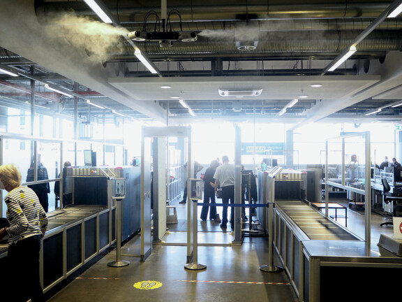 Seit 2019 sind am Sicherheitskontrollpunkt des Albrecht-Dürer-Flughafens Nürnberg 37 TurboFog-Hochdruckdüsenbefeuchter im Einsatz. Die an der Hallendecke aufgehängten Anlagen sind einzeln über dem Check-in-Bereich und dem Gepäckband positioniert. Der mikrofeine Nebel mit einer Tröpfchengröße von weniger als 15 μm wird durch Hochdrucktechnik erzielt, die das Wasser mit einem Betriebsdruck von bis zu 85 bar durch Hochleistungsdüsen presst. Im Vergleich zu druckluftbetriebenen Düsen- oder Dampf-Luftbefeuchtern fallen nur ein Bruchteil der Energiekosten an. Zusätzlich sorgt die Adiabate Kühlung der Verdunstung für ein angenehmes Raumklima: 100 Liter Wasser aus der Hochdruck-Düsenbefeuchtung nehmen rund 70 kW Wärme auf, bei einem Energieverbrauch von nur 0,6 kW. Die gewünschte Mindestluftfeuchtigkeit von 40 Prozent wird durch Raumsensoren geregelt, die die Klimasituation im Sicherheitskontrollbereich kontinuierlich überwachen und für ein gleichbleibend konstantes Feuchtigkeitsniveau sorgen. Die Hochdruckbefeuchter werden genau dann aktiviert, wenn der Sollwert nicht erreicht wird. Das neue System wurde über Modbus an das BACnet-Gebäudemanagementsystem angeschlossen, sodass alle Betriebsbedingungen jederzeit überwacht und die Luftfeuchtigkeitswerte aufgezeichnet werden können.