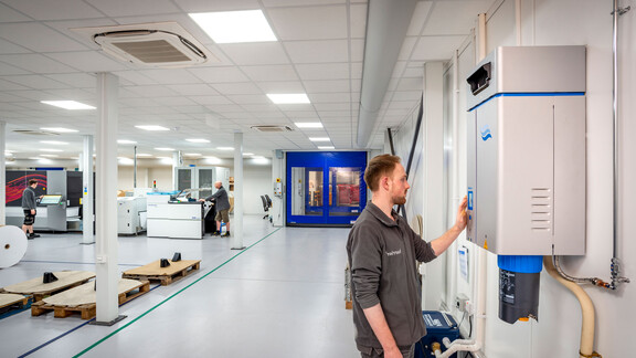 Dave Marshall-George, Vertriebsleiter bei Condair, fügt hinzu: „In der Druckindustrie muss die Luftfeuchtigkeit kontrolliert werden, um Ergebnisse von höchster Qualität zu erzielen. Der Condair RS ist eine beliebte Wahl für Digitaldruckereien, da er eine sehr genaue Feuchtigkeitsregelung bietet und über ein innovatives Kalkmanagementsystem verfügt. Wenn sich Kalk auf den Heizelementen bildet, wie es bei jedem Dampf-Luftbefeuchter der Fall ist, bricht er ab und fällt in einen Kalkauffangbehälter am Boden des Geräts. Dieser Behälter lässt sich leicht entleeren, sodass der Kalk aus dem System entfernt werden kann, ohne dass eine professionelle Wartung erforderlich ist.