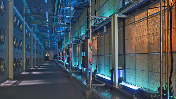 Sobald die kalte Außenluft in das Gebäude geleitet wird, vermischt sie sich mit der heißen Luft, die aus den Datenräumen zurückgeführt wird, wodurch die Temperatur steigt, aber die Luftfeuchtigkeit sinkt. 78 Sprüh- und Verdunstungsbefeuchter fügen dann bis zu 22.800 Liter Wasser pro Stunde dem Luftstrom hinzu, der durch die „Penthouse-Lüftungssysteme“ des Gebäudes strömt. Dadurch wird die ideale Luftfeuchtigkeit erzeugt und gleichzeitig die Temperatur wieder auf die erforderliche Versorgungsbedingung für die Zufuhr in die Datenhallen gesenkt.
