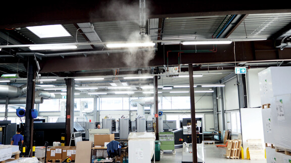 Für Peter Buchegger war der Ausbau einer zusätzlichen Produktionshalle, die bereits 2009 erworben wurde, ein Schlüssel zum erfolgreichen Wachstum des Unternehmens: „Diese Halle war ein echter Glücksfall, denn sie ermöglichte uns 2014 die Erweiterung unserer Kapazitäten und gleichzeitig Investitionen in neue Technologien und Verfahren.“ Heute sind der Offsetdruck und Teile der Buchbinderei in der umfassend renovierten Halle untergebracht. Mit dem Umzug wurde auch eine Befeuchtungsanlage in der Halle installiert, um stets optimale Produktionsbedingungen für die Druckmaschinen zu gewährleisten. „Absolute Qualität und Termintreue sind für unsere Kunden entscheidende Kriterien. Manchmal kommt es auf eine halbe Stunde an. Durch eine konstant optimale Luftfeuchtigkeit können wir Qualitätsschwankungen aufgrund von Passungsfehlern oder Produktionsunterbrechungen durch statische Aufladung verhindern“, erklärt Buchegger. Seit 2014 setzt Roser Druck ein Hochdruck-Befeuchtungssystem von Condair Systems ein. Zu den Kriterien für die Auswahl des Systems gehörten ein ultrafeiner, tropfenfreier Wassernebel sowie ein umfassendes Hygiene- und Servicekonzept. „Wir brauchten damals kein Vergleichsangebot. Die gebotene Qualität und die kompetente Beratung haben uns von Anfang an überzeugt und uns seitdem nicht enttäuscht“, erinnert sich Buchegger. 2017 wurde das Befeuchtungssystem auf die Druckvorstufe und den Digitaldruck im älteren Gebäude ausgeweitet.