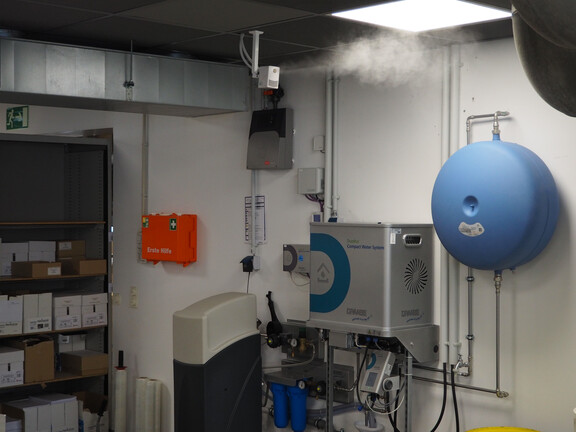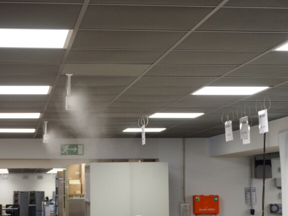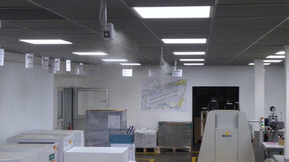 Seit Mai 2017 ist das Airport Print Center mit einer Direktraumbefeuchtung von Condair Systems ausgestattet. Aufgrund der niedrigen Decken in den Produktionsbereichen kam das Befeuchtungssystem Draabe NanoFog zum Einsatz, das individuell entsprechend den Arbeitsbereichen positioniert werden kann. Das Komplettsystem besteht aus neun Hochdruckbefeuchtern und dem kompakten Draabe DuoPur-System, das eine Reinwasseranlage mit einer Hochdruckpumpe kombiniert. „Die gewünschte relative Luftfeuchtigkeit von 52 % wird ganzjährig über digitale Raumsensoren aufrechterhalten, die die Befeuchter nur dann aktivieren, wenn die definierten Sollwerte unterschritten werden“, versichert Matthias Tietgen, der das Airport Print Center in Sachen Befeuchtung von Condair Systems berät. Für Markus Leis waren insbesondere die garantierte Hygiene und die einfache Wartung ausschlaggebende Faktoren bei der Wahl des Befeuchtungssystems: „Letztendlich hat uns die Zertifizierung des Systems überzeugt. Außerdem ist der Wartungsaufwand sehr gering und läuft praktisch von selbst“, fährt Leis fort.