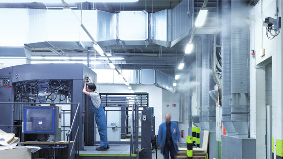 Seit 2012 sorgen sechs digital geregelte DRAABE TurboFogNeo 8-Luftbefeuchter für eine konstante Luftfeuchtigkeit im KOMORI Graphic Technology Centre Europe. „Mit dem DRAABE-System können wir unsere Maschinen nun das ganze Jahr über bei einer optimalen Luftfeuchtigkeit von 50–55 % ohne Probleme mit voller Kapazität vorführen“, erklärt Ad Ekelschot, Showroom-Manager bei KOMORI. Die Luftfeuchtigkeit lässt sich schnell und bedarfsgerecht an die Anforderungen verschiedener Drucksubstrate wie Papier oder Folie anpassen.