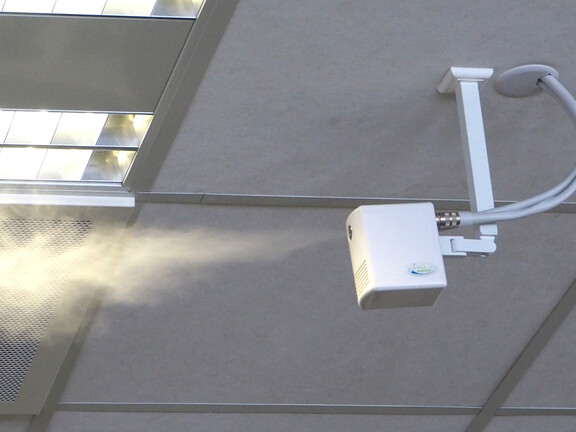 Seit 2017 ist das Thomann-Callcenter zusammen mit dem dazugehörigen Backoffice und der Buchhaltung mit einer Direktraumbefeuchtung ausgestattet. Das System nutzt das Draabe Nanofog-Befeuchtungssystem von Condair Systems. Dieses System besteht aus 46 kleinen Düsenbefeuchtern, die direkt in den Großraumbüros installiert sind und bei Bedarf einen feinen Nebel abgeben. Die Luftfeuchtigkeit wird durch digitale Raumsensoren geregelt, die das ganze Jahr über eine konstante relative Luftfeuchtigkeit von 40 Prozent gewährleisten. Für Alexander Schell aus der Bauabteilung von Thomann waren garantierte Hygiene und Wartungsfreundlichkeit die entscheidenden Faktoren bei der Wahl des Befeuchtungssystems: „Besonders beeindruckt hat mich die integrierte Wasseraufbereitung des Draabe-Systems, die garantiert, dass nur gereinigtes und keimfreies Wasser verwendet wird. Außerdem müssen wir uns als Anwender keine Gedanken um die Wartung machen. Die mehrstufige Wasseraufbereitung ist in transportablen Containern untergebracht, die alle sechs Monate vom Hersteller im Rahmen seines regelmäßigen Wartungsdienstes gegen vollständig gewartete und gereinigte Anlagen ausgetauscht werden. Die Betriebssicherheit und hygienische Leistungsfähigkeit sind von der Deutschen Gesetzlichen Unfallversicherung (DGUV) und dem Verein Deutscher Ingenieure (VDI) zertifiziert und werden bei installierten Systemen regelmäßig vor Ort rezertifiziert. Die integrierte Wasseraufbereitung des Systems ist in transportablen Containern untergebracht, die im Rahmen des Standardservices des Herstellers alle sechs Monate gegen vollständig gewartete und gereinigte Einheiten ausgetauscht werden.
