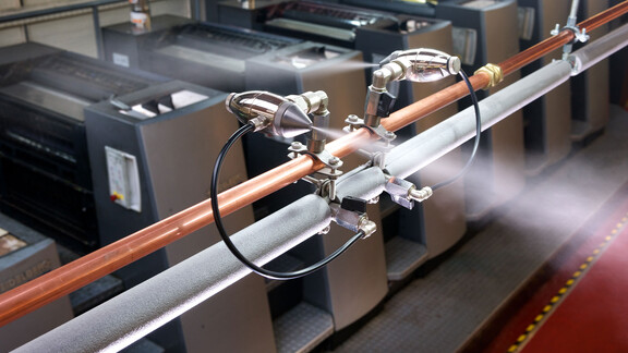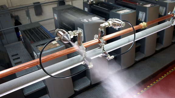 Papier ist ein hygroskopisches Material, das sehr empfindlich auf Änderungen der relativen Luftfeuchtigkeit (RH) reagiert. Für optimale Druck- und Lagerbedingungen sollte die Luftfeuchtigkeit zwischen 40 und 60 % RH gehalten werden. Die von Druckmaschinen und Heizungen in geschlossenen Räumen erzeugte Wärme kann zu einer Austrocknung der Luft und in der Folge auch des Papiers führen. Im Winter kann die relative Luftfeuchtigkeit auf 15 bis 20 % RH sinken, was zu statischer Aufladung und Druckproblemen wie Passungsfehlern, Bahnrissen, Papierwellungen und Papierrissen beim Falzen führen kann. Durch die Befeuchtung der Luft in der Umgebung von Druckmaschinen, Rollenständern und Papierlagern können solche Probleme drastisch reduziert werden.