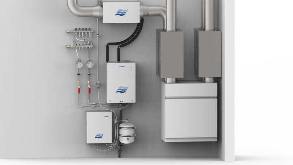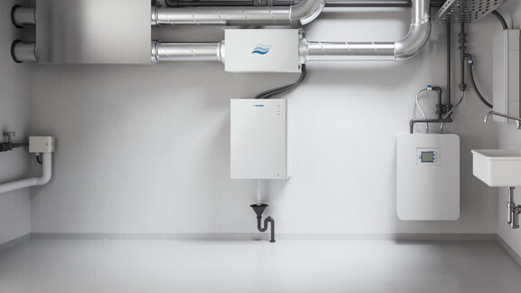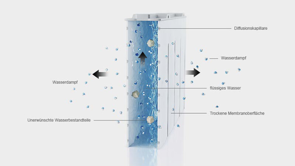 Das innovative Diffusionsvlies basiert auf einer hocheffizienten sterilen Membran. Es ist als kompaktes Vliespaket angeordnet, durch das Befeuchtungswasser fließt.