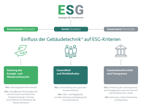 Avec le développement de la norme ESG et de la notation ESG (ESG = Environnement, Social, Gouvernance), on tente d'introduire une meilleure évaluation globale, qui contribue également à une valeur immobilière plus élevée (en termes de durabilité, de maintien et d'augmentation de la valeur). La technique du bâtiment a une forte influence sur les critères ESG :