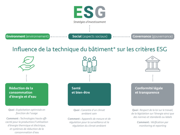Avec le développement de la norme ESG et de la notation ESG (ESG = Environnement, Social, Gouvernance), on tente d'introduire une meilleure évaluation globale, qui contribue également à une valeur immobilière plus élevée (en termes de durabilité, de maintien et d'augmentation de la valeur). La technique du bâtiment a une forte influence sur les critères ESG :