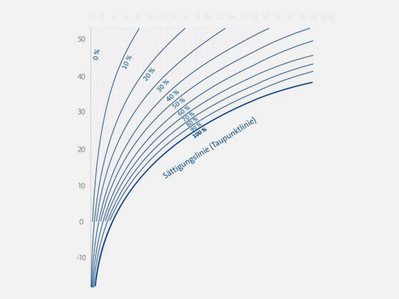 Supposons que nous ayons un bocal dans lequel la température de l'air est de 20 °C. Ce bocal contient 10 grammes d'eau par kilogramme d'air et l'humidité relative est de 70 %. Nous savons d'emblée que l'air est très humide et qu'il ne pourrait absorber que 30 % d'humidité supplémentaire. De plus, on constate que la ligne du point de rosée serait atteinte si l'humidité absolue augmentait de 5 grammes d'eau par kilogramme d'air. L'air atteindrait également la ligne du point de rosée s'il se refroidissait d'au moins 6 °C. Si l'on introduisait de la vapeur d'eau dans le récipient pour augmenter l'humidité de l'air, de la brume puis de la condensation se formeraient dès que l'on atteindrait 15 grammes d'eau par kilogramme d'air. À l'inverse, l'air atteindrait également la ligne de saturation et formerait ainsi de la brume et de la condensation si l'on abaissait la température de 6 °C.