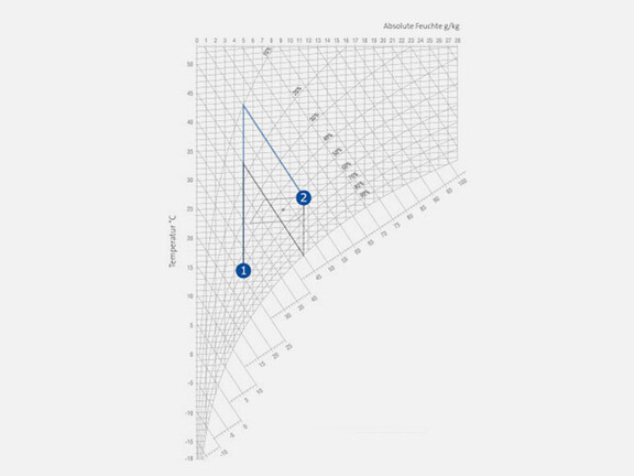 Besser eignet sich daher die energieeffizientere Variante der Enthalpie-Regelung. Bei dieser Methode wird die Luft auf Zielluft-Temperatur zuzüglich der Temperatur, die für den Vorgang der adiabaten Befeuchtung benötigt wird, erhitzt.