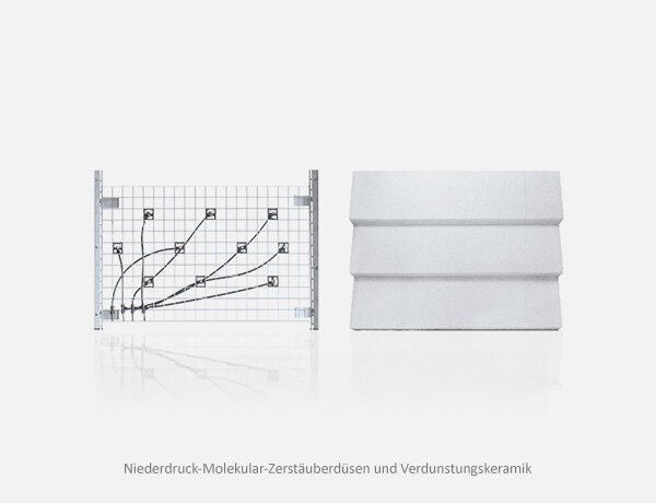 Ein Hybrid-Luftbefeuchter verfügt über eine Verdunstereinheit aus hochporösen, widerstandsfähigen Keramikelementen mit großer, innerer Oberfläche. Diese werden gleichmäßig und ganzflächig mittels Molekular-Zerstäubungsdüsen beaufschlagt. Die Düsen sind Vollkegeldüsen, die von einer kleinen Druckerhöhungspumpe mit vollentsalztem Wasser (zwischen 4 und 8 bar) versorgt werden. (Beim Einsatz einer Wasseraufbereitungsanlage mit frequenzmodulierter Pumpe kann eine Druckerhöhungspumpe an dieser Stelle gegebenenfalls entfallen).