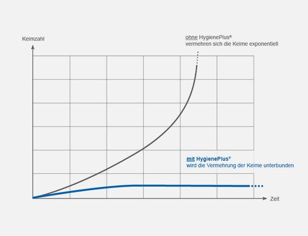 Das Keimdiagramm verdeutlicht die rasante Ausbreitung von Mikroorganismen, wenn keine geeigneten Maßnahmen zu ihrer Eindämmung getroffen werden. Für Keimneutralisation und präventive Vorbeugung setzt das HygienePlus®-Konzept auf natürliche Keimhemmung durch Silberionen. Die elektronische Regelung mit automatischer Kapazitätsüberwachung stellt eine exakte Dosierung mit konstanter Entkeimungswirkung sicher. Die Silberionen sorgen somit für hygienische Verhältnisse in allen wasserbenetzten Bauteilen des Befeuchtungssystems.