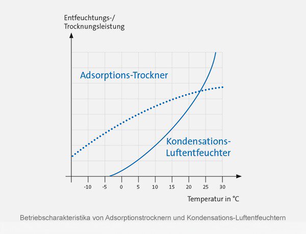 Kondensations-Luftentfeuchter eignen sich in der Regel für einen Betrieb bis ca. 45 % r.F. und einer Temperatur von ca. 5 – 36 °C. Bei abweichenden Konditionen Hersteller kontaktieren oder Adsorptionstrockner einsetzen.