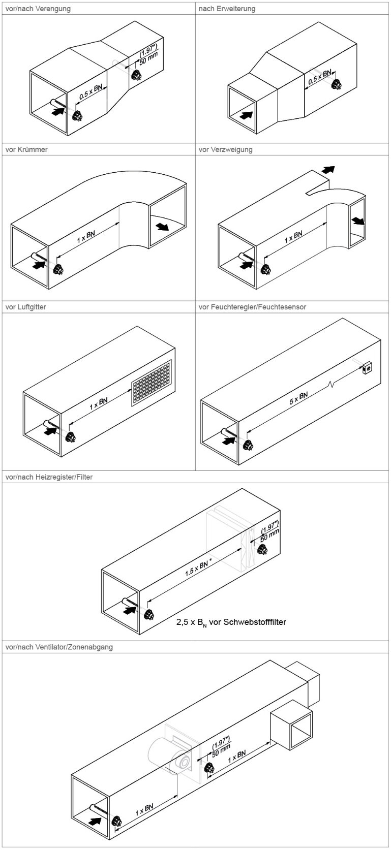 Damit der aus dem Dampfverteilrohr austretende Wasserdampf nicht an den nachfolgenden Anlagekomponenten kondensiert, müssen nachgeschaltete Anlagekomponenten einen bestimmten minimalen Abstand (auf der Basis der Befeuchtungsstrecke «BN») zum Dampfverteiler aufweisen.