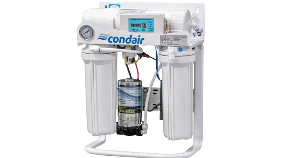 Système compact d'osmose inverse pour la production d'eau dessalée. Le système d'osmose inverse est destiné à être raccordé directement au réseau d'eau potable ou à un système d'adoucissement Condair Soft en amont.