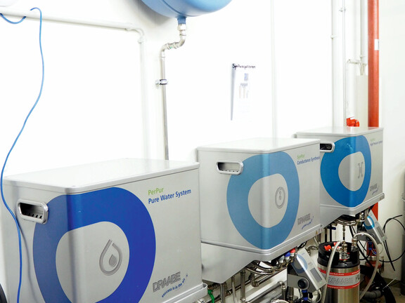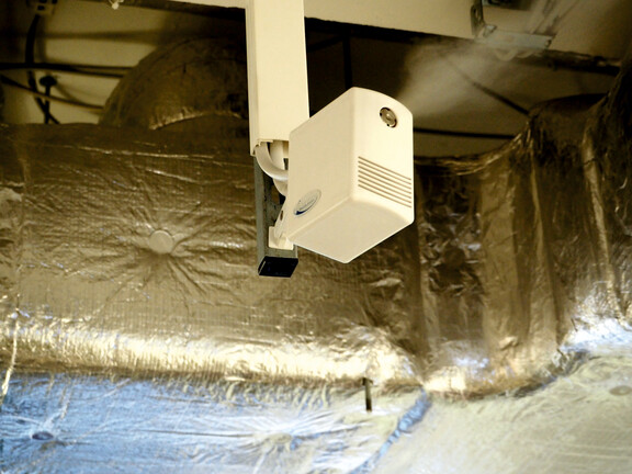 Depuis fin 2019, AOE dispose d'un système d'humidification directe en ambiance installé par le fabricant Condair Systems. Plus de 50 petits humidificateurs sont montés au plafond et, en cas de besoin, émettent une brume d'eau microfine qui est immédiatement absorbée par l'air ambiant. Une pression de 60 à 80 bars est nécessaire pour générer cette brume à peine visible, qui est acheminée vers les buses des humidificateurs via un système de tuyaux haute pression. L'eau est d'abord déminéralisée et stérilisée dans le cadre d'un processus de traitement en plusieurs étapes. Le système de Traitement de l'eau et le système haute pression sont tous deux installés dans des conteneurs transportables, qui sont automatiquement remplacés tous les six mois à des fins de maintenance. Pour Anne Petri, responsable du système d'humidification de l'air chez AOE, ce service offre un niveau de sécurité élevé et facilite le fonctionnement : « Le remplacement des conteneurs est un jeu d'enfant et peut être effectué en quelques étapes simples. Afin de constater par eux-mêmes les fonctions d'hygiène complètes du système, de nombreux employés ont même jeté un œil au système de Traitement de l'eau. Cela a renforcé l'acceptation du système dès le début. » L'humidité est contrôlée par de petits capteurs d'humidité qui mesurent en continu l'humidité relative dans les pièces et activent les humidificateurs selon les besoins. Chez AOE, l'humidité relative est régulée à un niveau constant de 40 %, valeur idéale pour protéger la santé et améliorer le bien-être.