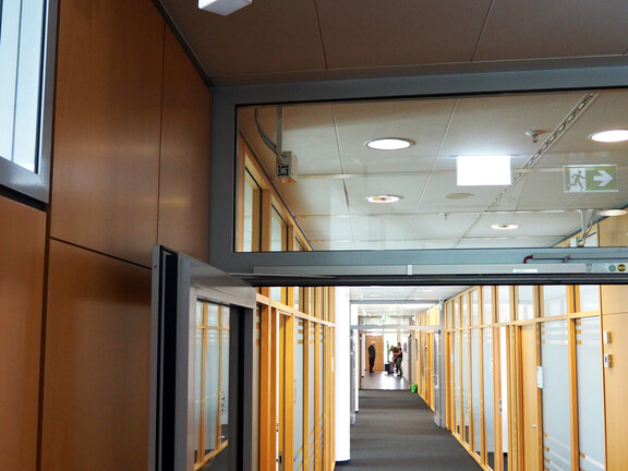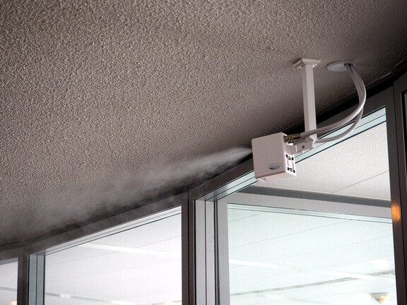 Depuis l'été 2017, 110 humidificateurs directs NanoFog sont en service à Bad Vilbel, garantissant une humidité relative optimale de 40 % tout au long de l'année. « Grâce aux options d'installation flexibles du système, les humidificateurs ont pu être utilisés exclusivement dans les espaces loués aux troisième et quatrième étages occupés par BHI et BHS », explique Matthias Tietgen, consultant technique chez Condair Systems, soulignant un avantage par rapport à l'humidification centrale. Le système d'humidification couvre les bureaux en open space, les couloirs et certains bureaux individuels. Le système NanoFog se compose de petites unités individuelles montées au plafond et sur les murs qui, en cas de besoin, diffusent uniformément dans l'air ambiant une fine brume dont la taille des aérosols est inférieure à 15 micromètres (μm) – un μm correspondant à un millième de millimètre. L'humidité est régulée par 27 unités de contrôle numériques qui activent les humidificateurs dans des zones définies lorsque les valeurs de consigne ne sont pas atteintes. Les humidificateurs sont reliés à deux systèmes de Traitement de l'eau situés au centre des locaux techniques. Avant d'être utilisée pour l'humidification, l'eau subit plusieurs étapes de filtration, de déminéralisation et de désinfection. Des fonctions automatiques de rinçage et d'hygiène empêchent, par exemple, que l'eau stagnante dans les tuyaux ne soit contaminée lorsque l'humidification n'est pas utilisée.