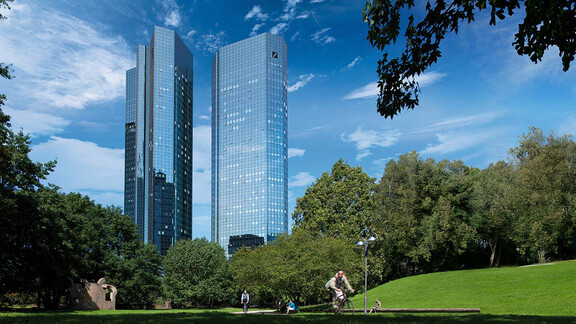 Les emblématiques tours jumelles de la Deutsche Bank (« Soll und Haben ») à Francfort, deux gratte-ciel en verre de 155 mètres de haut achevés en 1984, abritent le siège social de la plus grande banque allemande et offrent 120 000 m² d'espace de bureaux.