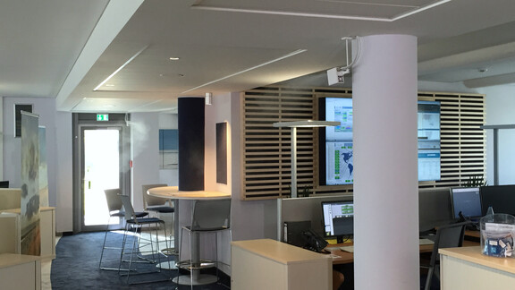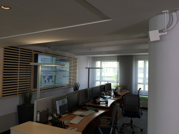 Afin de répondre de manière optimale aux exigences des postes de travail informatiques, les bureaux sont équipés depuis 2014 d'un système d'humidification directe en ambiance. L'humidification de l'air installée a posteriori protège les employés des contraintes particulières liées au travail intensif sur écran et aux activités vocales.
