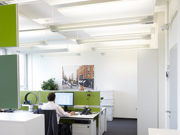 En déménageant à Munich, Amundi Allemagne offre à ses employés et à ses clients des locaux de grande qualité : des voiles de plafond et une moquette acoustique absorbent les sons et garantissent un aménagement moderne des pièces et des postes de travail équipés de dispositifs anti-éblouissement automatiques. Cependant, dès l'emménagement à l'été 2012, les employés ont commencé à se plaindre du climat intérieur très sec. La mesure de l'humidité dans les bureaux a révélé une humidité relative de seulement 11 à 23 %.