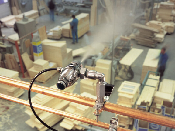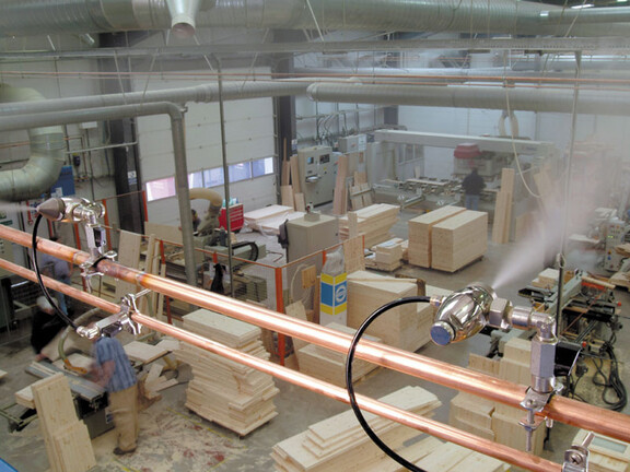 Le bois est par nature hygroscopique, c'est-à-dire qu'il est sensible à l'humidité ambiante. Afin d'éviter les déformations et les gonflements qui surviennent lorsqu'il est exposé à différents taux d'humidité, il est nécessaire de maintenir en permanence un niveau d'humidité optimal. Les humidificateurs à pulvérisation d'eau froide présentent l'avantage supplémentaire de supprimer la poussière dans l'atmosphère, ce qui, dans un environnement où le bois est scié, est très souhaitable et rend la zone beaucoup plus saine et agréable à travailler.