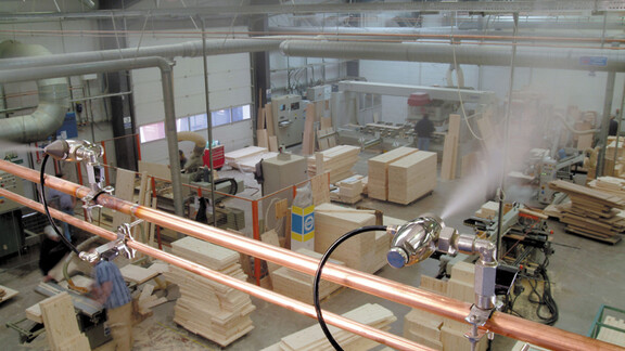 Le système Condair JetSpray maintient une humidité relative de 60 % dans les zones de stockage et d'atelier de Pinetum, empêchant ainsi le bois séché de se dessécher, de se déformer ou de se fissurer. Il supprime également les poussières en suspension dans l'air pour un environnement de travail plus sain et effectue l'Évaporation de jusqu'à 525 litres d'eau par heure de manière hygiénique, sans gouttes.