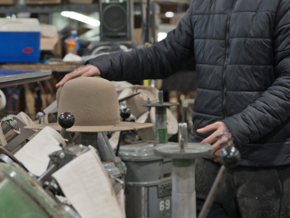 Ron Palin, directeur général des opérations chez Akubra, commente : « La clé de la fabrication d'un chapeau réside dans la formation du cône, qui s'effectue dans la machine de formage. Ici, la fourrure est aspirée sur un grand cône rotatif et, pendant qu'il tourne, de l'eau chaude est pulvérisée sur la fourrure. Cela permet d'entrelacer les fibres dans toutes les directions. Il est essentiel de maintenir l'humidité relative à 70 % dans la salle de formage afin d'éviter toute imperfection dans le feutre pendant ce processus, des défauts qui n'apparaîtront que plus tard, lors des étapes de finition. »