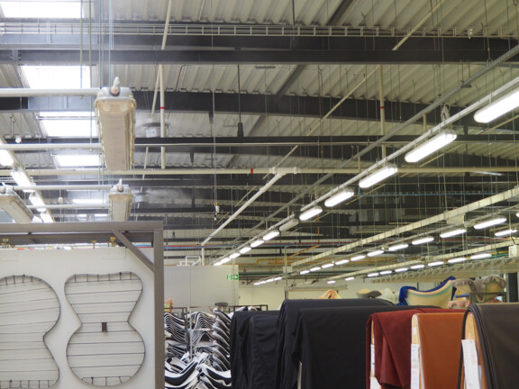 « Nos conditions de production doivent être optimales dans tous les domaines afin de répondre aux exigences élevées de nos clients en matière de qualité », explique Maciej Waldmajer, responsable de la maintenance chez Fritz Hansen. Pour garantir une barrière d'air optimale, Fritz Hansen utilise un système d'humidification à haute pression de type ML Princess dans la production et l'assemblage final. Les humidificateurs placés au plafond du hall protègent les chaises en placage moulées par compression contre le gauchissement et les fissures. De plus, l'humidité supplémentaire garantit un processus de peinture de haute qualité.