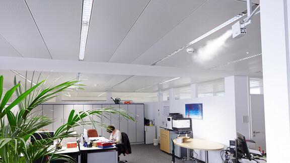 À Karlstadt, ainsi que dans les bureaux d'Esselbach, situés à 30 kilomètres, le système d'humidification de l'air DRAABE NanoFog est utilisé. Ce système est spécialement conçu pour une utilisation dans les bureaux et peut également être installé a posteriori. Il a ainsi été possible d'humidifier à la fois le nouveau bâtiment et l'ancien. Dans les deux parties du bâtiment, l'humidification de l'air dans le système de ventilation central n'était pas possible. Grâce à une commande numérique, 20 humidificateurs DRAABE NanoFog assurent désormais une humidité optimale de l'air comprise entre 40 % et 50 % tout au long de l'année.
