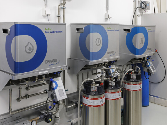 Pour l'humidification, Thomann utilise un système d'humidification directe en ambiance Condair Direct. Cette solution utilise de petites buses à haute pression qui transforment l'eau en une brume microfine à une pression pouvant atteindre 70 bars. Cette brume à peine visible est immédiatement et complètement absorbée par l'air ambiant, garantissant une augmentation constante de l'humidité. Le système est contrôlé par des hygromètres qui mesurent en permanence l'humidité dans la pièce. Dès que la valeur cible définie n'est pas atteinte, l'humidification s'active automatiquement jusqu'à ce que le niveau d'humidité optimal soit à nouveau atteint. Cela peut se faire pièce par pièce ou individuellement pour des zones spécifiques, ce qui permet de personnaliser les niveaux d'humidité dans différents espaces commerciaux, bureaux ou salles de réunion, par exemple. Pour Florian Rittweger, c'est un avantage crucial pour les ventes : « Différents instruments nécessitent différents niveaux d'humidité. L'humidification directe en ambiance nous permet de contrôler cela de manière très flexible. » Avant la nébulisation, l'eau est entièrement déminéralisée et désinfectée. Cela se fait dans un système de prétraitement qui fait partie du système d'humidification Condair. Le système de Traitement de l'eau intégré à plusieurs niveaux est logé dans des conteneurs portables, qui sont remplacés tous les six mois par le fabricant par des systèmes entièrement entretenus et nettoyés. « En tant qu'utilisateurs, cela signifie que nous n'avons pas à nous soucier de la maintenance et que nous pouvons être sûrs que l'hygiène et la fiabilité opérationnelle sont toujours garanties. C'est particulièrement important pour nous », souligne Alexander Schell. De plus, le système d'humidification est certifié par l'assurance sociale allemande contre les accidents (DGUV) et est régulièrement testé et recertifié sur place par l'Association des ingénieurs allemands (VDI) conformément à la norme VDI 6022, partie 6. Ces systèmes intégrés de Traitement de l'eau à plusieurs niveaux sont logés dans des conteneurs portables qui sont remplacés tous les six mois par des systèmes entièrement entretenus et nettoyés dans le cadre du service standard du fabricant.